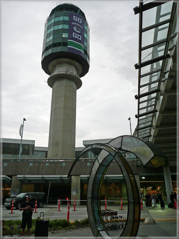 Um 20:15 Uhr fahren wir los Richtung Flughafen. Unterwegs wechseln wir auf einem Parkplatz noch unsere Sommerklamotten gegen etwas längere Bekleidung. Am Flughafen angekommen zeigt sich uns auch der Tower mit einer riesigen Canucks-Flagge geschmückt, nachdem schon die ganze Stadt mit Postern und Fahnen zugepflastert war.