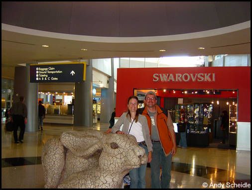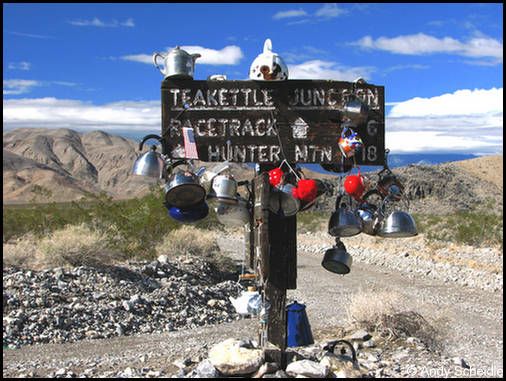 Nach 20 Meilen erreichen wir die berühmte Teakettle Junction. Der Wegweiser hängt wirklich voller Teekessel, die meisten mit Aufschrift, von wem und wann sie aufgehängt wurden, kurios. Die Road ist ab hier, entgegen den Aussagen der Ranger, gut zu befahren und man sieht schon aus der Ferne die Racetrack-Playa. Als wir den ausgetrockneten See erreichen, fahren wir auf einem guten sandigen Weg und sehen auch bald die ersten Steine auf der Playa liegen. Wir haben es geschafft, aber können wir auch die Spuren sehen? Die Spannung steigt und Elke testet die Beschaffenheit des Bodens, vorsichtig setzt sie einen Fuß auf die Playa, um zu sehen ob diese weich ist und ob eventuell Schuhabdrücke bleiben. Das wäre nämlich das Aus, für eine Exkursion auf die Playa gewesen. Aber wir haben Glück, Glück, Glück, der Boden ist steinhart, keine Abdrücke bleiben zurück, also rauf und erkunden.