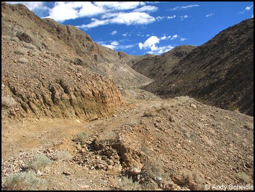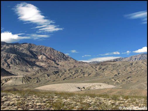 Zusammenpacken und wir fahren nach Norden, ab dem Abzweig zu Scotty´s Castle ist die Strasse immer wieder mit Schlamm und Kies überschwemmt worden, ich fahre in hohem Tempo drüber, manchmal fast zu schnell, weil die Umgebung einfach zu interessant ist, statt mich auf die Straße zu konzentrieren - zum Glück ist jetzt noch kein Verkehr. Dann biegen wir ab zum Ubehebe Crater und sehen uns diesen vom Parkplatz aus an, zum Rundgang reicht die Zeit leider nicht, vielleicht heute Nachmittag.