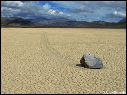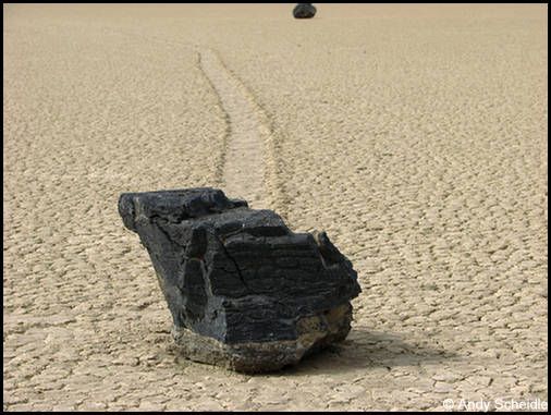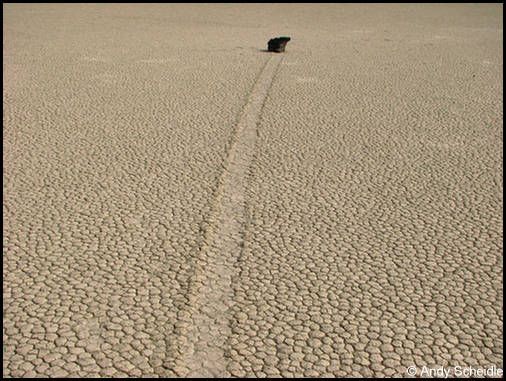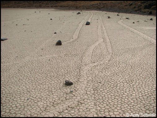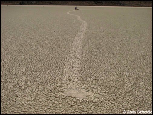 Es liegen nur ein paar Steine hier, aber die Tracks sind schon gigantisch, einfach unglaublich. Die Steine bewegen sich tatsächlich, keiner hat es je beobachtet und es funktioniert wohl nur, wenn es nass ist und der Wind stark genug bläßt. Manche Steine wiegen bis zu 100 Pfund und es bleibt ein Rätsel, aber es ist wahr.