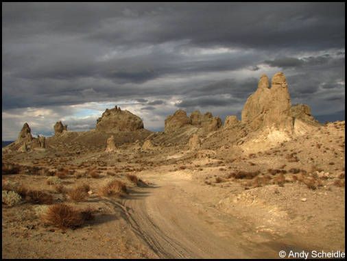 Das letzte Sightseeing Ziel heute sind die Trona Pinacles, Trona ist ein trostloser Ort, der von einer riesigen Chemiefabrik beherrscht wird. Eine Mineral Company beutet den Boden aus und es wird hier wohl auch Borax abgebaut und verarbeitet. Die Strasse zu den Pinnacles ist eine Schlammpiste, denn es geht auf dem Grund von einem ausgetrockneten See entlang und es hat erst vor kurzem geregnet. Durch die Pinnacles führen dann mehrere Wege, die man fahren kann und das tun hier viele. Auch wird überall gecampt, Väter und Söhne beschießen sich mit Farbe, ein richtiger Abenteuerspielplatz. Ich mache ein paar Fotos, dann schlingern wir wieder zurück. Der Ausflug hat sich eigentlich nicht gelohnt, aber weil es direkt am Weg liegt, sind wir halt hin. Wie unser Auto aussieht, kann man sich denken.