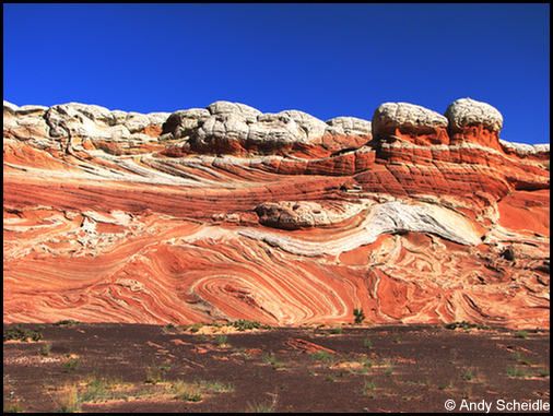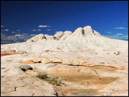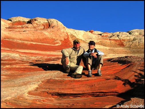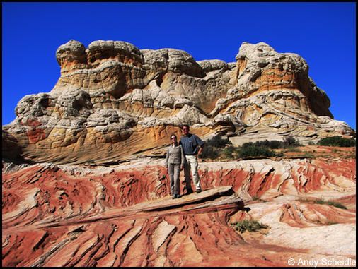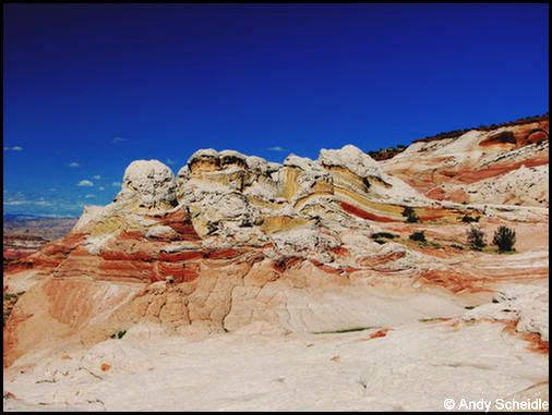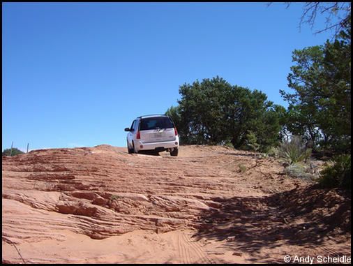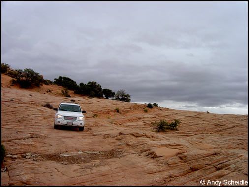 Ca. 1 km weiter stehen 2 Jeeps Laredo auf der Piste und sind wohl gerade am wenden. Es sind 6 Münchner, die sich nicht mehr sicher sind auf dem richtigen Weg zur White Pocket zu sein. Wir erklären ihnen den weiteren Weg und warnen vor der Abfahrt. Die wollen aber plötzlich nicht mehr weiter und überlegen von hier aus zu laufen. Ich hoffe ich konnte sie überzeugen doch zumindest auf den Hügel zu fahren und von dort aus zu starten, da sie ihrem Jeep auch nicht allzu viel zutrauen, der permanente Allrad und die niedrigere Bodenfreiheit ist nicht gerade hilfreich für diese Strecke, ja sogar gefährlich.