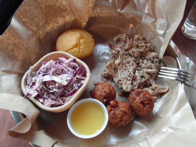 Ob es lecker aussieht oder nicht, bleibt jedem selbst überlassen, aber es war grandios. Das ist pulled pork mit corn bread und cole slaw. Weiß leider nicht mehr wie die Bällchen hießen, aber das war eigentlich auch corn bread nur frittiert mit so einer süßlichen Sauce. Ziemlich gut.