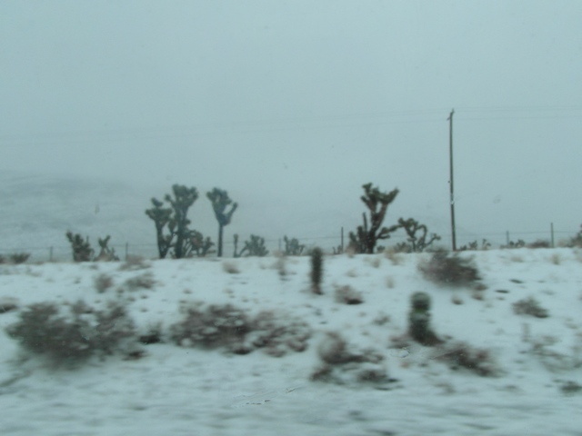 Bei Starbucks frühstücken wir schnell einen Muffin und dann gehts auch ab ins Auto.  Wir verlassen Las Vega über die I-15 und müssen dann durch einen kleinen Teil der Mojave Wüste über einen kleinen Bergpass. Und da ist er dann doch - der Schnee. Wir hatten uns schon gefreut durch Kanada und den hohen Norden Amerikas ohne Schnee gekommen zu sein, und da taucht er auf, mitten in der Wüste und ziemlich unwirklich.  :)  Es gibt aber auch ein Beweisfoto. Allerdings ist dies aus dem Auto raus gemacht wurden, denn wir haben nicht wie ganz viele Leute einfach am Straßenrand angehalten und ne Schneeballschlacht gemacht.   :verwirrt: