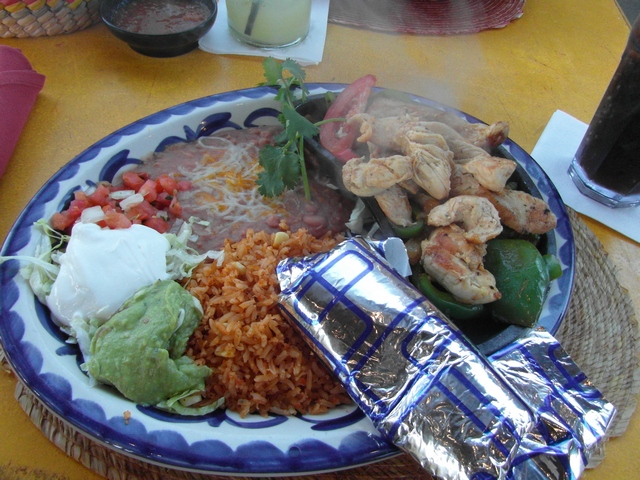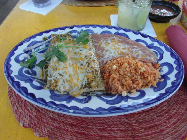 Und Tim hatte die Enchiladas de Puerco con Salsa Verde und eine Margarita im Hintergrund.