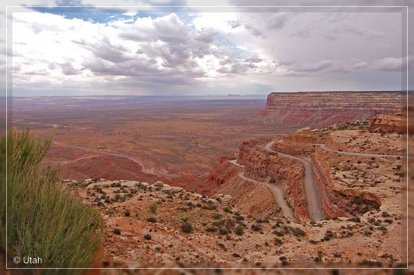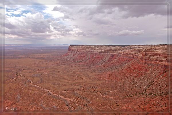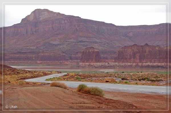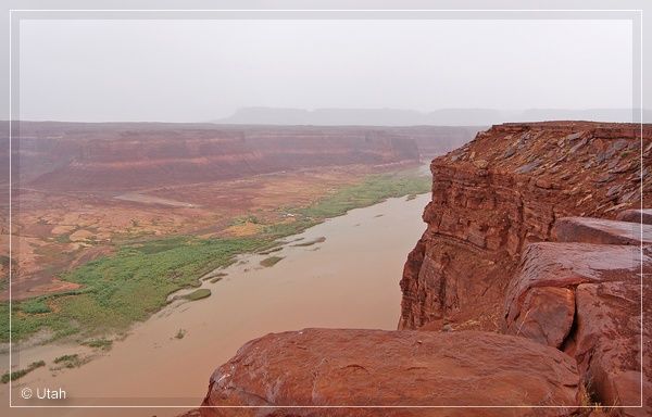 Kurz vor Green River fing es an zu regnen. Um 10.30 Uhr bogen wir von der I70 auf die 24 Richtung Hanksville. Inzwischen hatten wir Dauerregen. Unser heutiges Programm mußten wir somit streichen. Was also tun ? Da wir morgen zum North Rim des Grand Canyons wollten, machte ich den Vorschlag halt einen Fahrtag einzulegen und näher an den North Rim zu fahren. Nach der allgemeinen Zustimmung aller fuhren wir weiter nach Süden. Da ich wußte an welch schönen Ecken wir hier im Regen vorbeifuhren wurde ich traurig, aber ich komme wieder, bei Sonne!