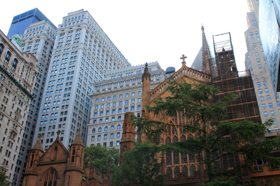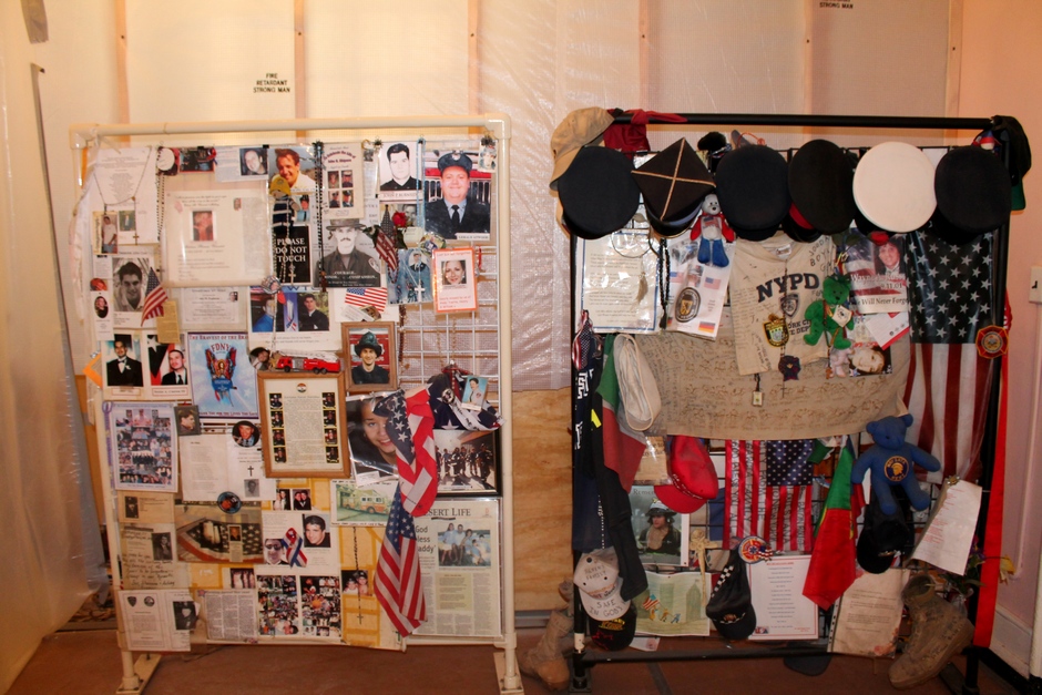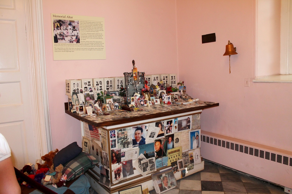 Von hier aus gingen wir zur St. Paul´s Chapel, diese Kirche in unmittelbarer Nähe zum Ground Zero wurde damals nicht beschädigt und diente in der Zeit nach den Anschlägen als Hilfsstation für alle Helfer, welche sich dort ausruhen konnten und betreut wurden. Hier gibt es im Gedenken daran auch viele Sachen zu sehen, wie Polizeiabzeichen aus der ganzen Welt, Briefe von Angehörigen, Stofftiere von Kindern, Vermisstenaufrufe und vieles andere mehr. Auch das ging mir sehr nahe muss ich sagen.