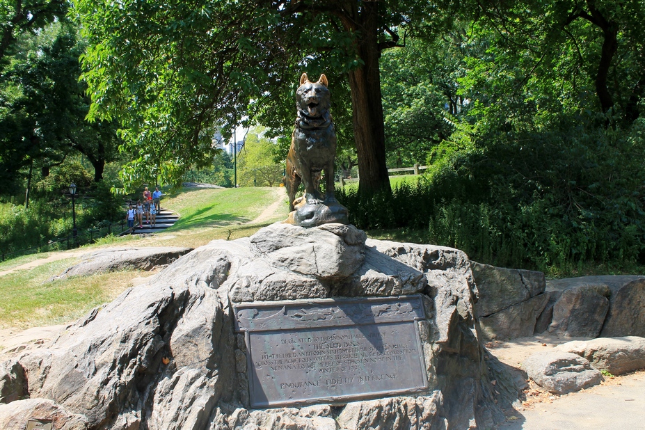 Nächster Tagesordnungspunkt sollte der Central Park sein. Mit der U-Bahn, ich hab keine Ahnung welche Linie wir genommen haben, kamen wir dann an der Südwestecke am Columbus Circle an und holten uns an der Info-Bude einen Park Plan. Der ist auch notwendig, ganz schön groß hier. Mit Getränken noch versorgt, es war schwül-heiß mittlerweile, kamen wir an der Balto-Statue vorbei :