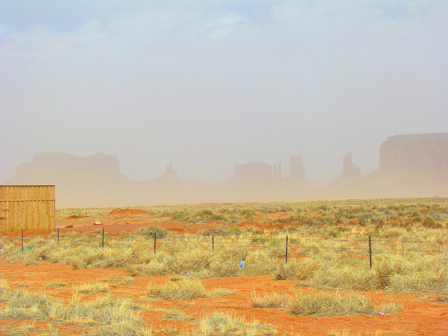 Je näher wir dem Monument Valley kamen, desto stärker wurden die Sandstürme. Irgendwann konnte man die Felsen am Straßenrand nur noch erahnen. Wir überlegten mehrfach wieder umzudrehen, weil es bei dem Wetter einfach keinen Sinn machte. Ich weiß gar nicht mehr warum, aber wir fuhren weiter! Direkt vorm Parkeingang wurde es dann auch schlagartig besser. Was ein Glück! Wir bezahlten also den Eintritt und fuhren erstmal zum Visitor Center um uns dort ein wenig umzusehen.