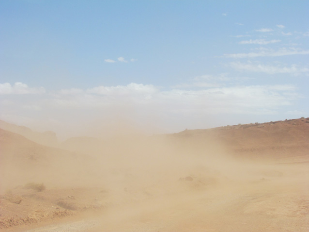Auf dem Weg dorthin merkten wir, dass wir dem Braten noch nicht trauen konnten. Der Sandsturm setzte wieder ein und wir rannten relativ Orientierungslos ins Gebäude. Dort angekommen hatten wir dann auch unsere zweite Mahlzeit des Tages im Mund. "Knirsch, knirsch, knirsch", lecker Sandkuchen