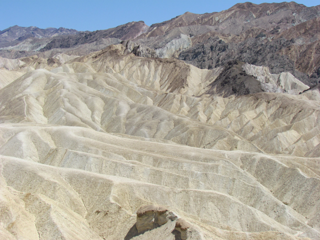 Wir bogen bei der Furnace Creek Ranch erstmal östlich ab um den Zabriskie Point anzufahren. Meine Frau hatte nicht wirklich besonders Lust den Aufstieg hoch zu gehen, aber Sie tat es trotzdem um des Urlaubsfriedens willen. Die Wärme machte uns langsam zu schaffen. Wir schoßen ein paar Fotos und gingen auch wieder recht schnell zurück.