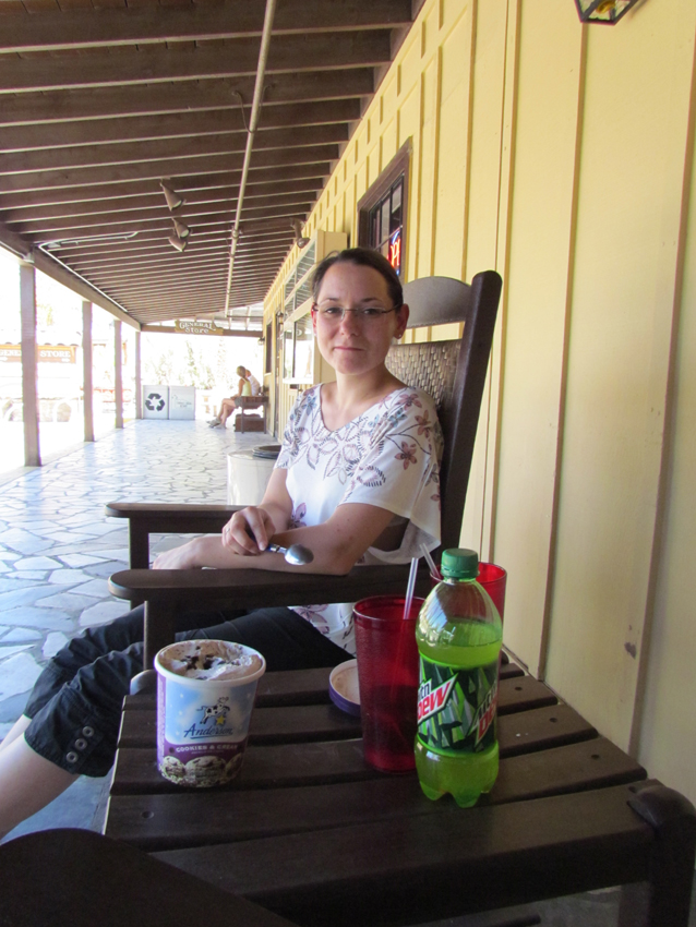 Nationalpark T-Shirt, eiskalte Mountain Dew und ein großes Eis wanderten aufs Kassenband des Visitor Centers. Auf der Veranda waren ein Glück auch 2 Schaukelstühle frei, die wir dann auch gleich beschlagnahmten. Jetzt gings uns wieder besser und das Eis war in Rekordzeit vernichtet  :D. Wir stellten uns nochmal kurz unter den Wasserzerstäuber vor uns und liefen leicht abgekühlt zurück zum Auto.