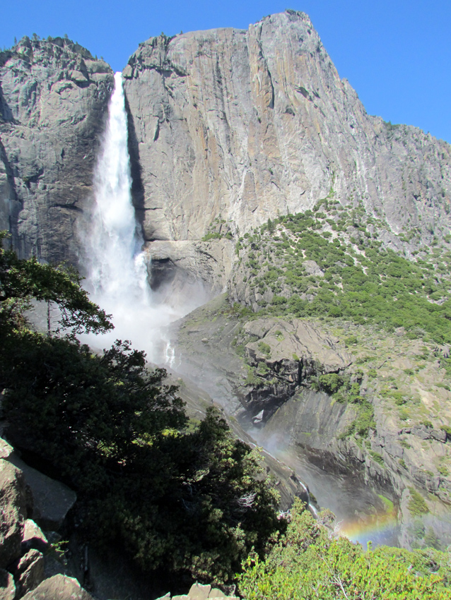 Nach ungefähr 3 Stunden erreichten wir die Aussichtspunkte zu den Upper Yosemite Falls. Diese kündigten sich bereits weit vorher an. Es klang wie ein Unwetter. Es donnerte pausenlos, wie bei einem Gewitter. Unglaublich wie man die Kraft des Wassers hören konnte! Die beim Aufprall entstehende Gischt erzeugte unterhalb des Wasserfalls auch noch einen Regenbogen. Paradiesisch!