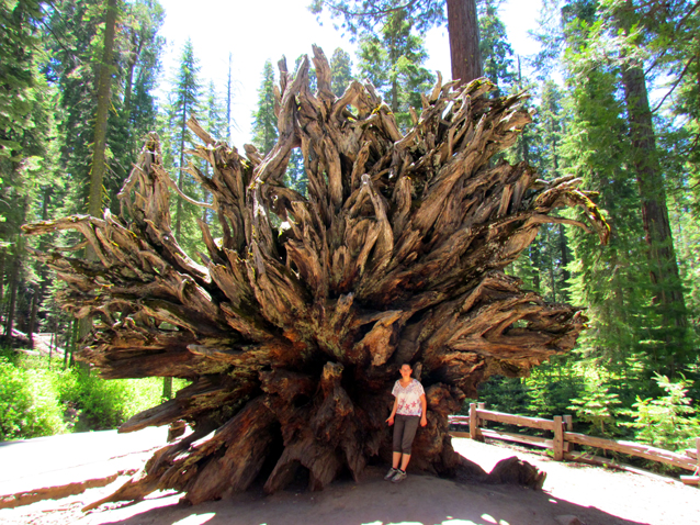 Am Visitor Center angekommen, ging es gleich auf den Wanderweg. Unser Ziel waren die "Bachelor & Three Graces" Bäume, so wie der "Giant Grizzly und der "California Tunnel Tree". Schon am Anfang des Trails begrüßte uns der "Fallen Monarch". Die Wurzel des umgefallenen Mammutbaumes war gigantisch.