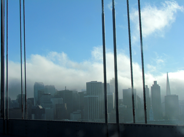 Auf der Brücke sahen wir dann, dass San Francisco uns standesgemäß begrüßte. Grade zog dichter Nebel in die Stadt und verdeckte uns die Sicht auf die Skyline.