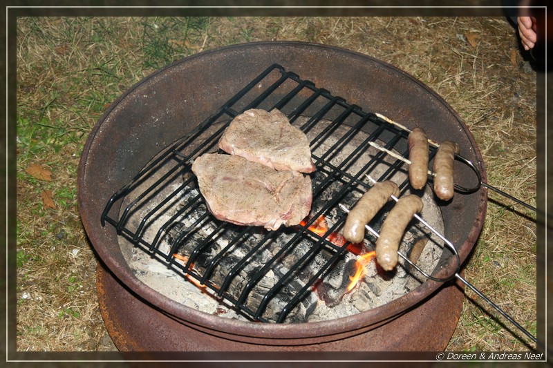 Das Problem, dass die Autofelgen-Feuerstelle nicht über ein Grillrost verfügte lösten wir ganz pragmatisch und benutzten das Metallrost des Gasherdes aus unserem Wohnmobil. Dessen Ecken passten genau in die Felge.