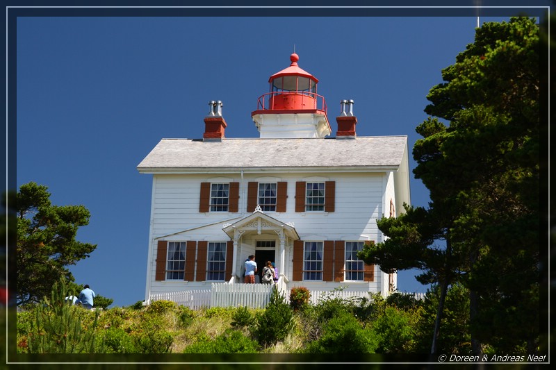 Ale erstes fuhren wir noch einmal zum Yaquina Head und informierten uns kurz im Interpretive Center. Lisa und Vincent beschäftigten sich unterdessen in der Kinderecke, wo sie einige spannende Spiele entdeckten, so dass wir sie kaum wieder von dort loseisen konnten. Irgendwann gelang es uns aber doch und wir fuhren zum Lighthouse. Im Gegensatz zu gestern Abend stand der Leuchtturm  heute sehr fotogen im Sonnenlicht.