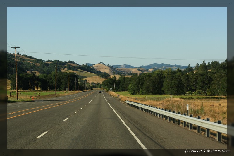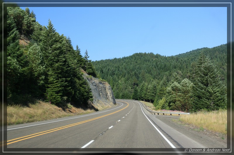 Nach einer Weile änderte sich die Landschaft; es wurde deutlich wärmer und trockener. Ab Myrtle Point wand sich die Straße entlang des Middle Fork des Umqua River bergauf. Es ging durch dichten Wald bis auf eine Hochebene, später dominierten mehr und mehr Hügel das Landschaftsbild.