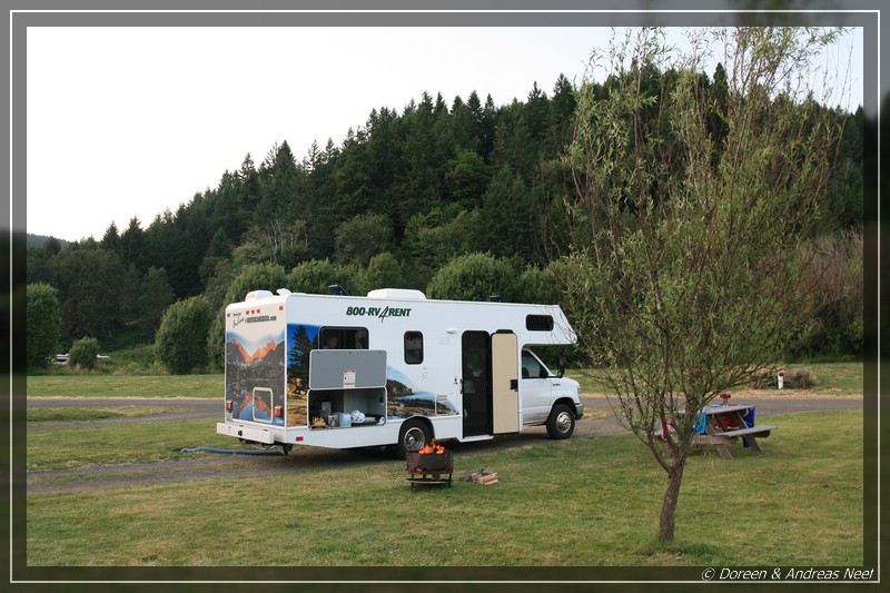 Nachdem wir Winston passiert hatten, bogen wir auf den I-5 in Richtung Norden ab und erreichten kurz darauf Roseburg. Hier stillten wir zunächst den Durst unseres Wohnmobils, dann bekamen wir je einen iced Coffee, Lisa ein Eis und Vincent eine Packung Pringles. Auf dem Highway 138 ging es dann weiter bis nach Idleyld Park. Wir checkten im Elk Haven RV Park ein, einem ruhigen, schön gelegenen Platz mit Pool und free WiFi. Der Host war sehr nett und brachte uns sogar noch einen Picknicktisch sowie eine Ladung Feuerholz ans Wohnmobil. Wir erfrischten uns zuerst einmal im Pool, bis die Sonne hinter den Wipfeln verschwand, und spielten anschließend Frisbee auf der Wiese. Dann richtete Doreen das Abendbrot, während Andreas ein Lagerfeuer entfachte.