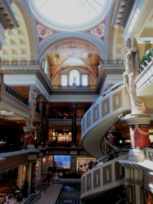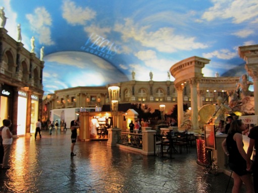 Boh, bin ich müde! Ich habe mal wieder schlecht geschlafen und bekomme meine Augen kaum auf. Für's Hotel-Frühstück sind wir schon zu spät dran (das gibt es nur von 7.00 - 9.00 Uhr), daher besorgen wir uns bei Vons Milch, Raisan Bran, Bagels,  Philadelphia und Obst und frühstücken anschließend in unserer "Wohnung". Ich bin absolut antriebslos, aber Thomas hat Hummeln im Hintern, schließlich sind wir in Las Vegas. Recht hat er - also raffe ich mich auf. Wir parken unser Auto im Caesar's Palace und schlendern an den Forum Shops vorbei. Ich bin immer wieder beeindruckt von dem künstlichen Himmel. Er wirkt wirklich täuschend echt.