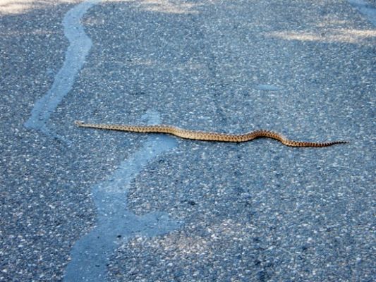 Um 6.00 Uhr sind wir schon wach, packen unsere Sachen ins Auto, checken aus und frühstücken bei Denny's. Nochmal tanken, dann verabschieden wir uns von Page und von den roten Felsen und fahren den letzten Teil unserer Reise entgegen. Las Vegas! Über Kanab fahren wir die 59 und dann auf die 15. In Kanab machte Thomas plötzlich eine Vollbremsung! Mitten auf der Straße windet sich eine Schlange! Wir scheinen die einzigen zu sein, die das bemerkenswert finden, denn alle anderen fahren weiter…