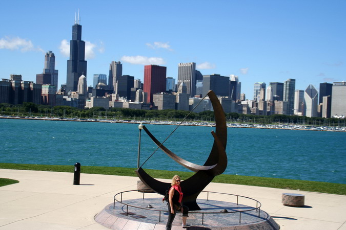Durch das tolle Wetter (strahlend blauer Himmel, aber nur 20° C) angesteckt, gingen wir zum Yachthafen. Der Weg führte durch einen Park, wo viele Erdkugeln in verschiedenen Varianten von verschiedenen Künstlern aufgebaut waren. Manche hielten wir auf ein Foto fest. Am Yachthafen setzten wir uns auf einer der vielen Bänke und genossen den Blick auf die Skyline von Chicago.