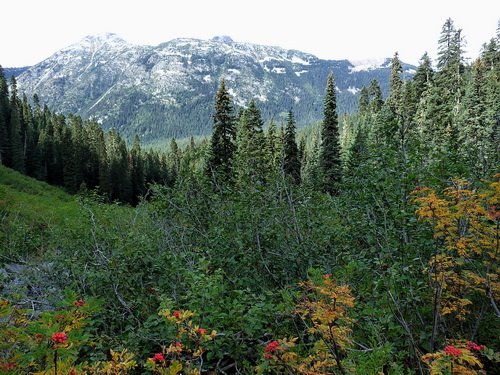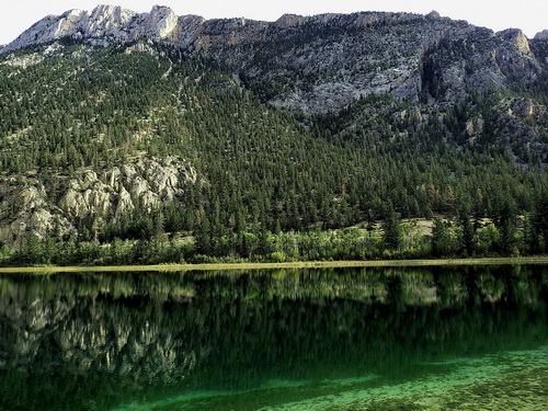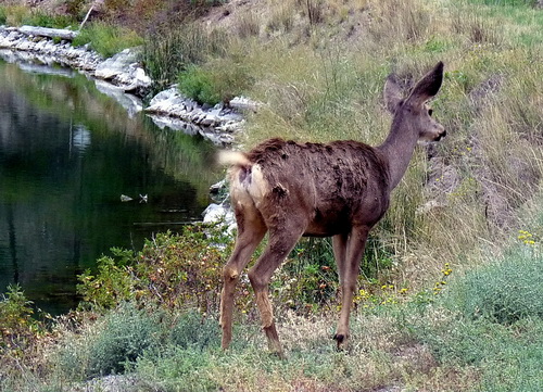 Dann gehts auf zum Manning Provincial Park. Die Landschaft ist sehr schön. Allerdings fängt es jetzt leicht an zu regnen. Eine kleine Pause machen wir noch am Yellow Lake. Direkt am See sehen wir Rehe. Gerade als ich alle 4 im Visier habe, schrecken sie auf und rennen weg. So nur ein Foto von einem Reh von hinten!!