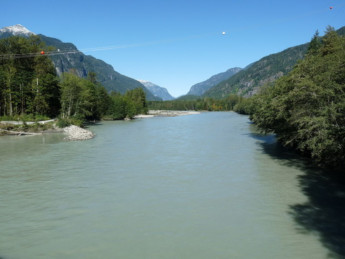 Dann gehts weiter zurSquamish Valley Road. Dort sollen 2 sehr beeindruckende hohe Wasserfälle sein. Wir fahren durch schöne Landschaft bis die geteerte Strasse endet und eine Schotterpiste anfängt. Das Navi sagt noch 3km. Okay, das geht ja noch. Wir fahren teilweise wieder nur mit 10kmh. Das Navi sagt Ziel erreicht. Aber keine Wasserfälle. Hmm, wir fahren nochmal ca. 3km aber immer noch nichts. Hier ist aber eine Brücke mit Blick auf Fluss und Berge!!