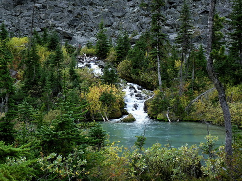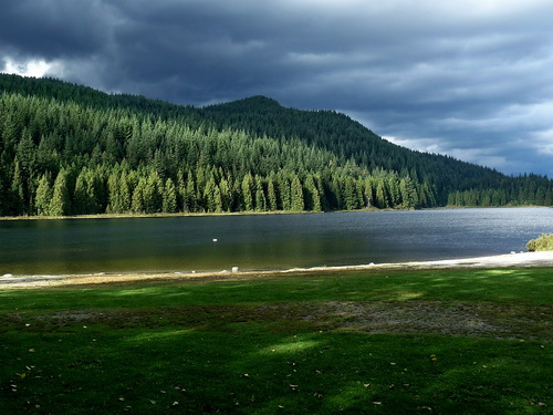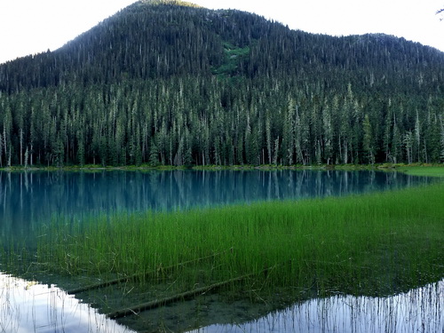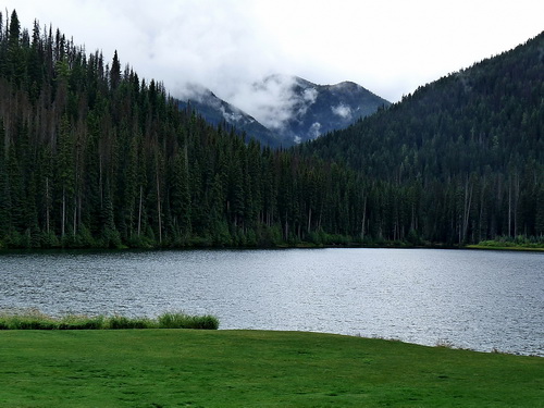 Dann gehts in den Manning PP. Hier wollen wir auch viel wandern. Nur leider regnet es hier doch sehr stark. Unser erstes Ziel, die Similkameen Falls finden wir nicht. Dann gehts zum Lightning Lake. Dort stehen plötzlich ganz viele Autos und von weitem sehen wir viele Menschen in Sportbekleidung. Was ist hier denn los?? Wir steigen aus und nähern uns dem Treiben!! Dann winkt ein freundlich älterer Herr uns heran und fragt wer wir sind.Hmm... Ist das ein Sicherheitscheck?? Nein, er denkt wir wollen hier mitlaufen. Wir klären das Missverständnis auf. Es ist übrigens ein Crosslauf. Im Stillen habe ich gedacht, dass wir ja jetzt so eine gute Kondition haben, dass keiner eine Chance gegen mich hätte. Das wollte ich den Teilnehmern nicht zumuten, die sich wahrscheinlich Jahre auf diesen Lauf vorbereitet haben. Mensch, habe ich eine soziale Ader!! Aber gut, Startschuss und wir feuern mit an!! Sie verschwinden schnell am anderen Ende des Sees im Wald. Wir gehen ein wenig um den See spazieren. Lightning Lake!!!