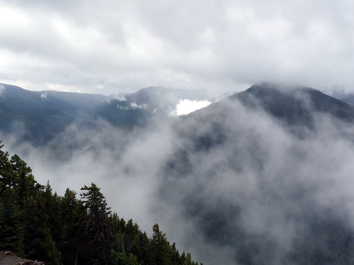 Das Wetter wurde kurz darauf noch schlechter und wir entscheiden uns eine lange Wanderung ausfallen zu lassen. Das hätte keinen Sinn gemacht. So fahren wir zum Cascade Lookout. Eine 8km lange Stichstrasse führt uns in Serpentinen einen Berg hinauf. Aber gut ausgebaut und asphaltiert. Wir erreichen einen Viewpoint. Aber die Aussicht ist nicht besonders, wegen der wolkenverhangenen Berge. Aber gerade dieser Umstand läßt die folgenden Fotos doch recht nett erscheinen. Cascade Lookout!!
