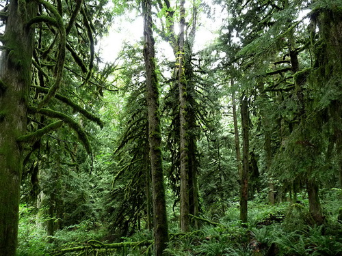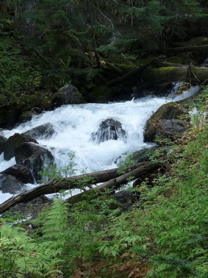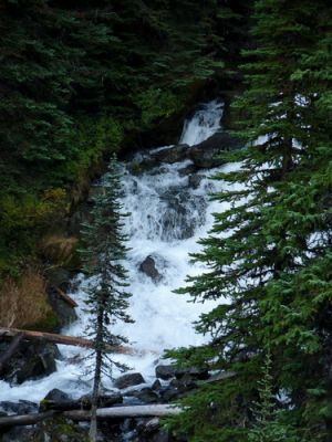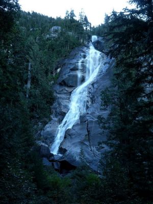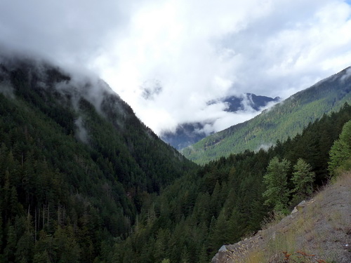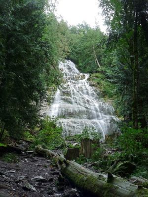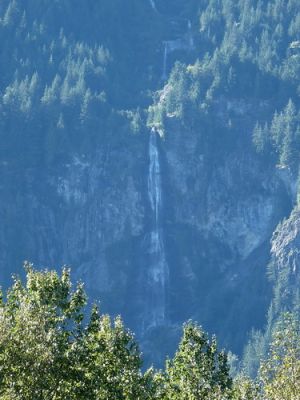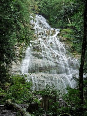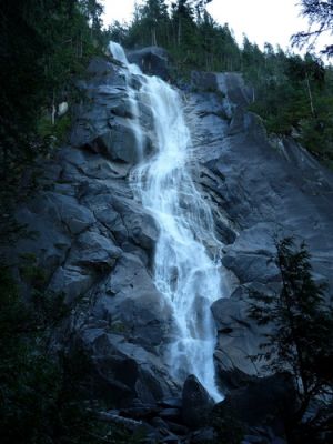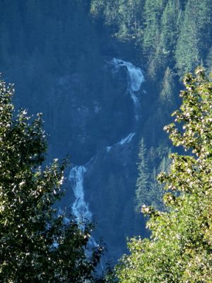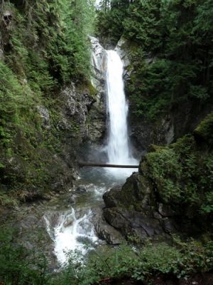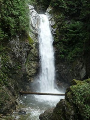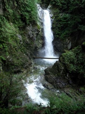 So, was tun!! Eine weitere 8km lange Schotterstrasse führt weiter den Berg hoch. Aber wir können hier schon nichts mehr sehen. Auch die anderen geplanten Wanderungen machen keinen Sinn. Wir entscheiden uns für Plan B. Wir fahren einen Umweg in die Lowerlands, da wären wir nur ca. 60km von Vancouver entfernt. Da gibt es noch Wasserfälle, die ja nicht wetterabhängig sind!! Es sind auch nur 1,5 Stunden Fahrt von hier zu den Bridal Veil Falls!! Recht schnell sind wir auch da!! Ein 1km langer Trail, der durch Wald führt, bringt uns zu diesen Fällen. Zu dieser Jahreszeit nicht so üppig, aber trotzdem ganz nett!!