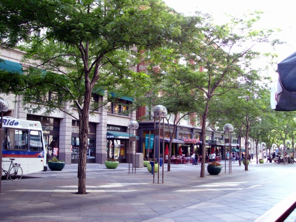 Dann wollte ich im neuen Navi unser Hotel eingeben. Aber es wollte die Adresse nicht annehmen, bis mir einfiel das unser Hotel an einer Fußgängerzone lag. Ich gab die Seitenstraße an und siehe da wir konnten losfahren. Es war ein entspanntes fahren, und wir fanden unseres Hotel das Courtyard by Mariott Hotel Downtown auf Anhieb. Auf dem Parkplatz gaben wir gleich unseren Autoschlüssel ab, und das Auto wurde dann weggefahren nachdem wir unser Gepäck ausgeladen hatten. Ob wir es jemals wiedersehen? Das Eincheken ging schnell, und wir bekamen trotz Pricline ein schönes Zimmer. Zum Tagesausklang gingen wir noch ein wenig durch die Fußgängerzone. Wie gut das hier viele Bänke standen, denn auf Ihnen konnte ich mich öfters ausruhen, Jörn eine rauchen und Denver auf uns wirken lassen.