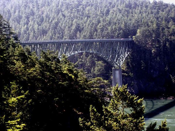Die Brücke ist eine der Sehenswürdigkeiten im Pazifischen Nordwesten und besteht eigentlich aus zwei Teilen. Einer führt über den nördlicher gelegenen Canoe Pass, der zweite über den Deception Pass im Süden.