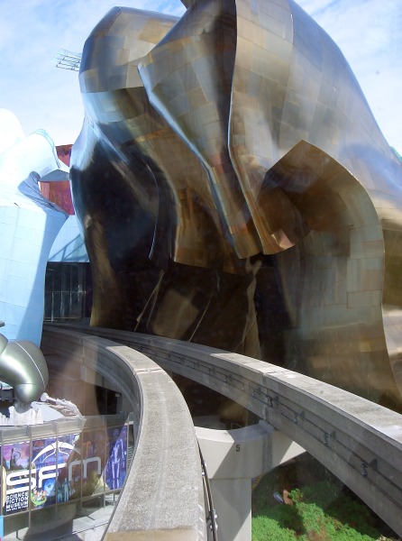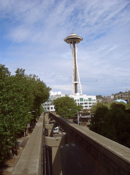 Und von dort ging es dann weiter mit der Streetcar. Die Fahrkarte kann man nur mit der Kreditkarte lösen. Jörns Karte konnte er gar nicht lesen, also mußte ich ihm die Fahrt spendieren. Sonst funktionierte seine Karte überall einwandfrei, nur bei den Automaten der Streetcar nicht. Von der Streetcar ging es mit der Monorail welche das Stadtzentrum mit dem Seattle Center und der dortigen Space Needle verbindet, interessant ist dabei die Linienführung auf den letzten Metern, welche direkt durch das architektonisch interessante Gebäude des Science Fiction Museum führt.