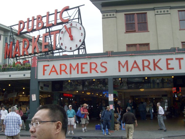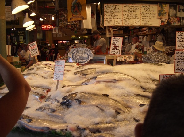 Danach machten wir die Innenstadt zu Fuß unsicher. Doch sie ist schön und viel bergiger als ich sie mir vorgestellt habe. Besonders gut gefallen hat mir das historischen Hafengebiet im Herzen von Seattle mit den Markthallen. Der Pike Place-Markt ist einer der ältesten Bauernmärkte der USA, die ständig in Betrieb sind. Auf dem Markt gibt es Stände für frischen Fisch, Obst und Gemüse, Kunsthandwerk, Lebensmittel aus aller Welt, Geschenkeläden, Second-Hand-Kleidung, Antiquitäten und Sammlerstücke, internationale Restaurants, Cafés und Snackbars. Hier gibt es sogar fliegende Fische. Die Händler werfen sich zum Gaudi der Touristen die Fische zu.