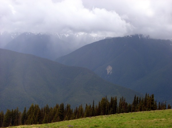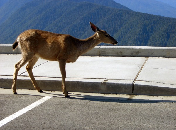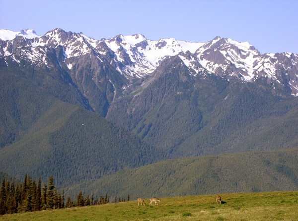 Auf dem Highway 101 West fahren wir nach Port Angeles, dem Zentrum des Nordens. Von hier geht’s hinein in den Olympic National Park. Neben der Hauptverwaltung liegt das Visitor Center. Wir decken uns ein mit Infos zum Park. Es gibt sehr viel Anschauungsmaterial zu den Gebirgszügen und den Gewässern im Park. Dann fuhren wir rauf zum Hurricane - Ridge. Es ging mal wieder weit nach oben 1585 Meter üM. Man hatte uns gesagt, das man den schönsten Blick auf die Olympic Mountains von der Hurricane - Ridge hat. Am dortigen Visitors Center gibt es zahlreiche lohnenswerte Trails mit schönen Ausblicken auf die schneebedeckten Gipfel, die Täler, die Blumenwiesen und auf die umherlaufenden Rehe. Es lag Schnee und wir hatten eine tolle Aussicht  :(. Alle Gipfel waren in Dunst und Nebel verschwunden.