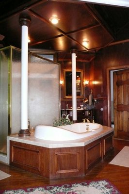 Auch hier haben wir das ganze Haus für uns allein, zumindest bis zum sehr späten Abend. Rachel und Ron bieten uns an, dass wir uns auch gern in den anderen Gästezimmern aufhalten können. Wir ziehen uns bald in unsere Suite zurück, denn noch uriger als der Bedroom ist der Bathroom.