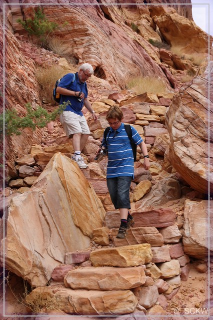 Erstes Ziel heute Morgen: natürlich die Fire Wave. Der Einstieg in den "Trail" ist dank neuer Beschilderung einfach zu finden. Ebenso einfach können wir anfangs dem Trampelpfad folgen. Doch wie geht’s dann weiter? Ich bin der Meinung, wir müssten in den Wash. Wellenähnliche Strukturen sind da auch gleich zu finden.