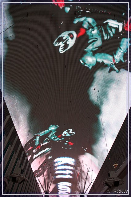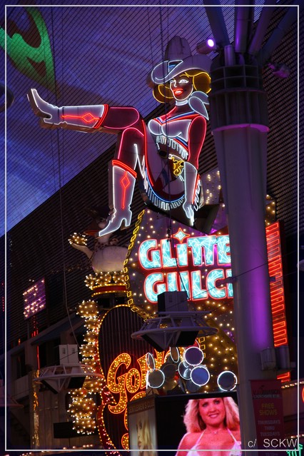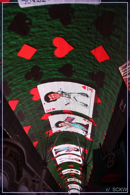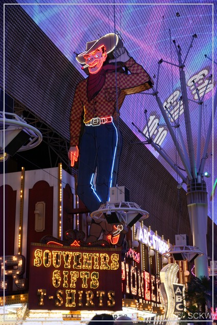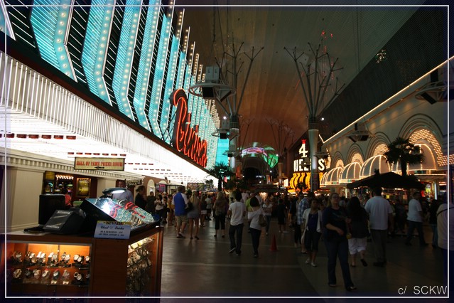 Am Flughafen mit reichlich Anreiseverkehr vorbei landen wir auf dem Strip. Es geht erstaunlich flüssig voran. Wir checken im Flamingo ein, wo wir ein schönes Doppel-Queen-Zimmer im 19. Stockwerk mit Blick auf Ceasars Palace und den Bellagio See erhalten. Kurze Verschnaufspause und Anhübschen, dann kann‘s losgehen. Ziel:  Downtown. Seit  unserer ersten USA-Reise 1989 waren wir dort nicht mehr und da hat sich ja einiges getan. Laut einem Hausprospekt kommt man mit Monorail und Bus dorthin. Karten für erstere sind im Package enthalten. Viel los ist an und in der Bahn nicht gerade, noch weniger am Endpunkt. Es ist ziemlich düster und einsam dort und wo dieser Bus halten soll, auch nicht klar.  Wir folgen also den zwei, drei anderen Leuten Richtung Stratosphere Tower. Auch hier steppt nicht gerade der Bär. Immerhin ergattern wir ein Taxi zur Fremont Street.