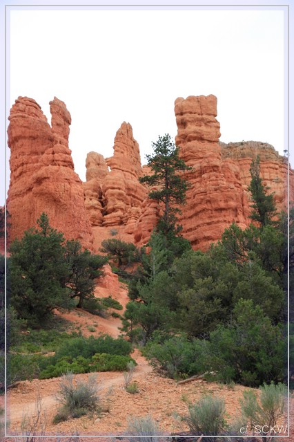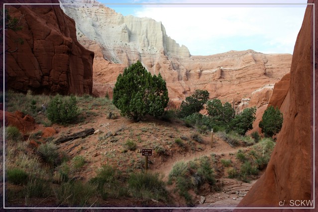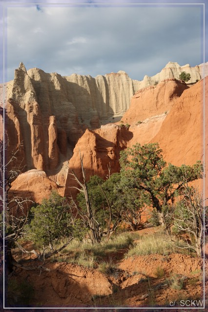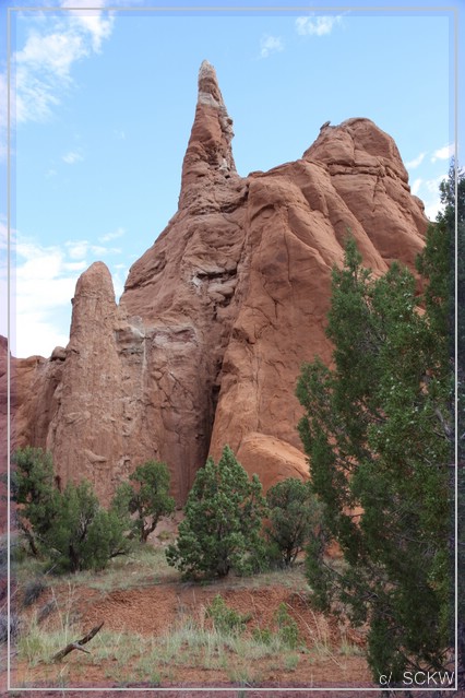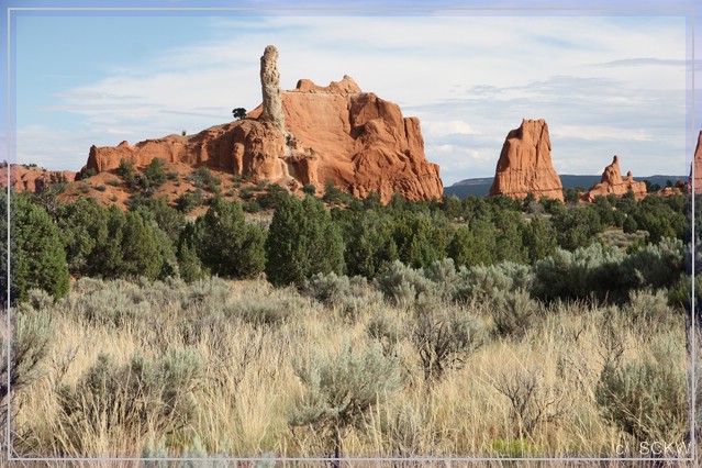 Rote Sandwege schlängeln sich durchs Gelände. Von Wacholder artigem Gebüsch, Gräsern, Blumen und Bäumchen gesäumt. Neben den Schornstein ähnlichen Felssäulen, gibt es auch bunte Wände und kleine Boxcanyons zu sehen.