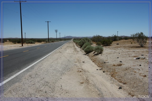 Wir kommen der Wüste näher. Schließlich erreichen wir Palmdale. Kein Ort, über den man viel sagen muss. Außer, dass offensichtlich über die Pampa das übliche Schachbrettmuster von Strassennamen gelegt wurde. Schnurgerade der Palmdale Blvd, gekreuzt von durchnummerierten Streets, die auch einfach nur mal Fahrspuren im Sand sind. Parallel dazu Buchstaben- Avenues. Ziemlich viel Aufwand für die paar Behausungen, die wir sehen.