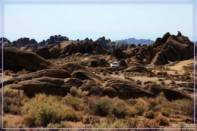 Die Gegend ist interessant: trockener, struppig bewachsener Boden, Felsblöcke wie hingeworfen und am Horizont die Bergkette der Sierra Nevada.  Eben eine Western-Kulisse – davon wurden hier ja auch einige gefilmt.