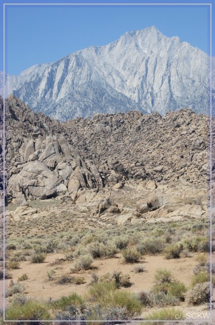 Zur Mittagspause fahren wir auf der Whitney Portal Road weiter nach Westen. Erst geht es noch relativ eben an Wüste und Granitbrocken vorbei, dann an einer Bergflanke hinauf. Immer wieder Mt. Whitney im Blick, den höchsten Berg der 48 Lower US States (4421 m).