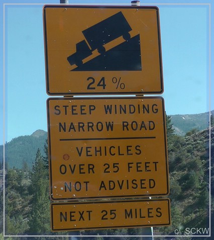 Die Nevada State Line kündigt sich schon an, als wir nach links in die Berge abbiegen, um zum Hwy 4 zu gelangen. Dafür müssen wir über den 8314 ft (rund 2500 m)  hohen Monitorpass. Wir schrauben uns also hinauf. Ich dachte ja, dass sich die Straßen schon auf einer gewissen Höhe treffen. Aber nee, es geht wieder runter auf 5500 ft bis zur Kreuzung  :P Weiter geht’s westwärts. Dieser Teil des Hwy 4 ist auch bekannt als Ebbetts Pass Scenic Byway. Die Strecke folgt eine der alten Querungen der Sierra Nevada aus der Gold - und Silberrauschzeit. Begrüßt werden wir bald von diesem Schild ...
