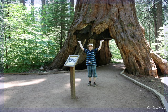 "Pioneer Cabin Tree" wurde ausgewählt, da er eine breite Basis und eine große Feuer-Narbe hatte