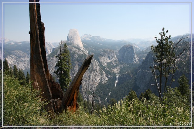 Erster Stopp ist bei den Überresten des Discovery Trees. Entdeckt wurde der 1852 von einem Jäger, der einen verwundeten Grizzly verfolgte. Zuerst dachten die Leute, er würde ihnen Märchen erzählen. Also führte er eine Gruppe Männer dorthin und schon bald kamen auch die ersten Besucher. Leiderwurden auch Spekulanten angezogen und gut ein Jahr später wurde der Baum gefällt. Fünf Männer brauchten dafür 22 Tage. Teile der Rinde und Baumscheiben wurden als Wanderausstellung auf Reisen geschickt. Schon damals hagelte es Proteste gegen diesen Vandalismus, beispielweise von dem bekannten Naturschützer John Muir.