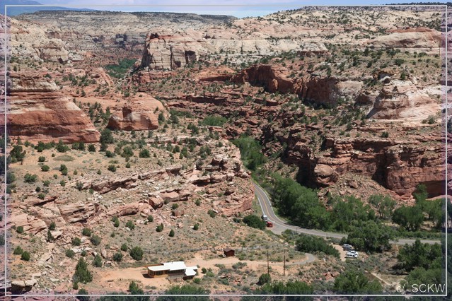 Erst mal geht es durch den Capitol Reef NP. Hier gäbe es zwar auch noch das ein oder andere zu unternehmen, doch diesmal passt es leider nicht. Ein kurzer Stopp sollte eigentlich der Fremont River Badestelle dienen, doch selbiger sieht nach den Regenfällen von gestern nicht allzu einladend aus. Rotbraune Brühe.  :P Es scheint ordentlich was herunter gekommen zu sein, denn so viel Wasser hatten wir dort beim letzten Mal nicht. Offenbar ist auch die Furt ins Cathedral Valley gesperrt.