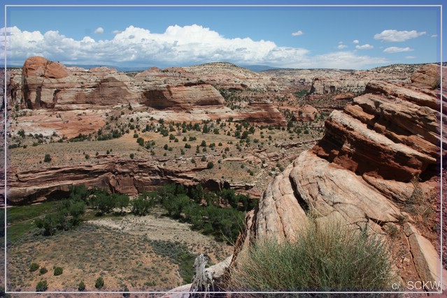 Alles in allem verbringen wir knapp 90 Minuten vor Ort. Wenn nicht in der Ferne Donner gegrollt hätten, wären wir vielleicht noch etwas geblieben. So machen wir uns auf den Rückweg und brauchen dafür 20 Minuten weniger als hinzu. Am Trailhead, wo es Park- und Campingplätze gibt, dann noch ein ausgiebigeres Picknick, ehe es weiter auf der UT 12 geht. Eigentlich war noch ein Abstecher auf den Burr Trail angedacht, aber dafür ist es mal wieder zu spät.