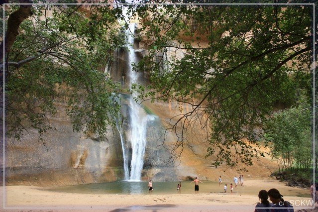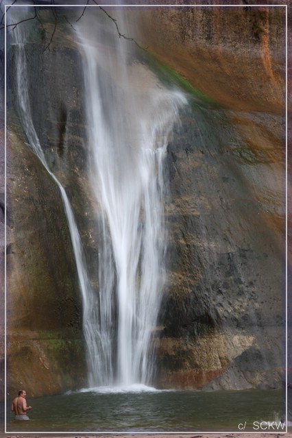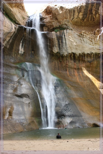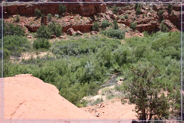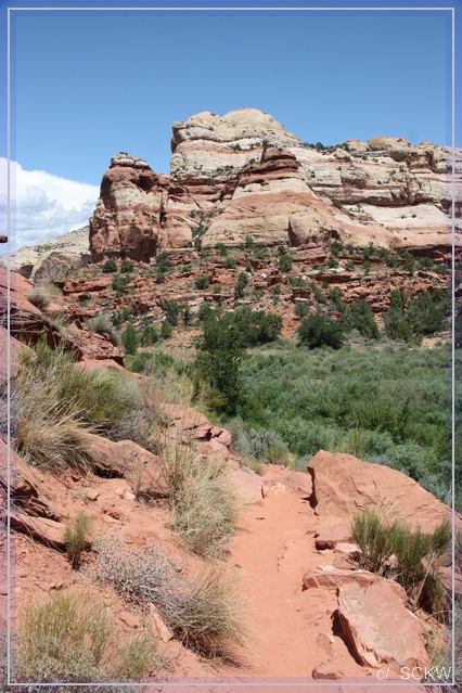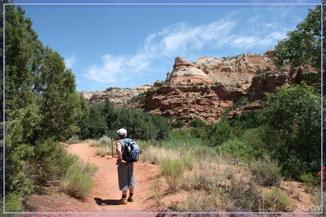 Der Weg folgt dem Lauf des Calf Creek – so habe ich gelesen. Darunter habe ich mir immer halbwegs schattiges Ufer vorgestellt. Bäume und Büsche stehen am Creek auch reichlich herum. Der Pfad jedoch verläuft meist oberhalb am Felsen lang, sandig, steinig, voll in der Sonne und das drei lange Meilen. Wenigsten geht ein hauchfeines Lüftchen.