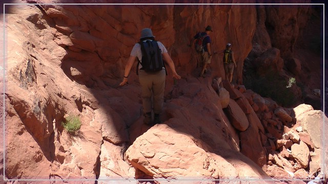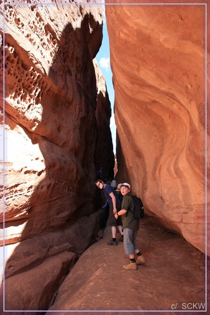 Der Weg führt überwiegend über Sand und Fels und ist manchmal steinig. Es geht enge Spalten treppenartig hinauf und wieder hinunter. Ab und zu ist ein großer Ausfallschritt oder beherzter Hüpfer erforderlich (je nach Länge der Beine  :pfeifen:). Oder kreative Gangtechniken..